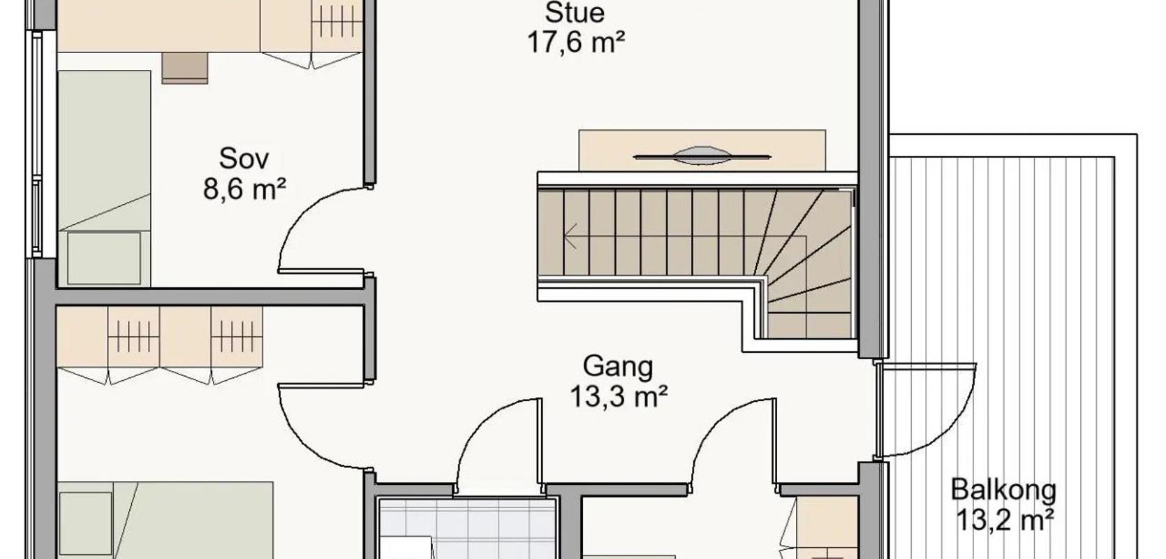 Huset har pulttak og skrå himling, slik at man i andre etasje får en flott takhøyde på loftstuen. Det er to balkonger ut ifra andre etasjen, slik at man kan velge hele dagen om man ønsker å følge sola eller skyggen. Balkongen ut fra loftstuen er overbygd og har vegger på to kanter. Det gjør balkongen lun og fin. Glassrekkeverket gjør at den allikevel føles luftig. Andre etasjen har også tre soverom og et bad.