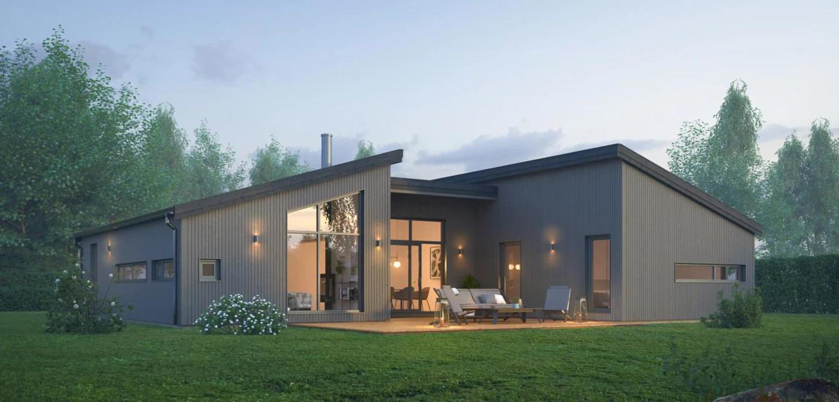 Stryn er et romslig og stilfullt hus med unikt og moderne design. Funksjonell og god romdeling med ulike fløyer, og alt på ett plan.