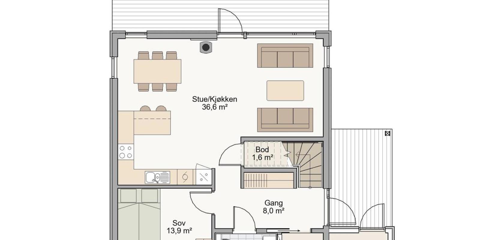 Skansen har et praktisk overbygd inngangsparti, med sportsbod rett utenfor hoveddøren. Dett gjør det lett å sette fra seg barnevogn eller andre ting som ikke trenger være med inn i huset. Rett innenfor døren er det også en bod. Videre kommer du inn til en romslig stue med utgang til terrasse. Det er plass til peis midt mellom spisestuen og stuen, slik at man kan få glede av den uansett hvor man sitter. Huset har et romslig L-formet kjøkken, med mulighet til å bygge på en bar-løsning. Etasjen har også et stort soverom og et bad.